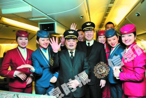 2012年南航最后一個(gè)航班飛機落地后,機組人員合影留念。信息時(shí)報記者 蕭嘉寧 攝