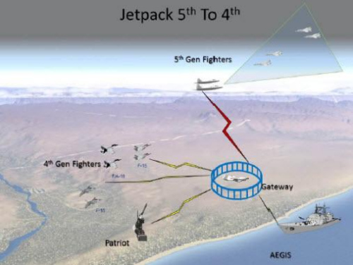 一旦試飛取得成功,美國空軍就將正式接管該項目,在此基礎上建立一個(gè)“在冊項目”并為其提供資金。美國空軍的一些官員們將該項目稱(chēng)為“從五代機到四代機”(5th to 4th),意思是從五代機向四代機傳送數據。該項目的作戰概念要求將網(wǎng)關(guān)安裝在一架單獨的平臺上,并且該平臺可保持處在視線(xiàn)內。這意味著(zhù)網(wǎng)關(guān)平臺需要飛得足夠高——例如像“全球鷹”無(wú)人機的飛行高度——以便在敵方防區外與己方部隊保持通信;或者,該網(wǎng)關(guān)平臺應具有隱身能力。ACC在其演示文件中顯示的網(wǎng)關(guān)平臺是“全球鷹”,但漢米爾頓表示空軍并未就網(wǎng)關(guān)平臺的選擇做出最后決定。該項目的另一個(gè)主要目標是將所有需要的部件都裝在網(wǎng)關(guān)平臺上,而不需要為戰斗機加裝任何設備,因為,為F-22或F-35加裝任何天線(xiàn)而又不損害它們的隱身性能,是一件麻煩且費錢(qián)的事情。