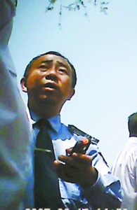 第一個(gè)趕到現場(chǎng)搶救傷者的他正在向領(lǐng)導匯報當時(shí)的情況。記者 陶剛 攝