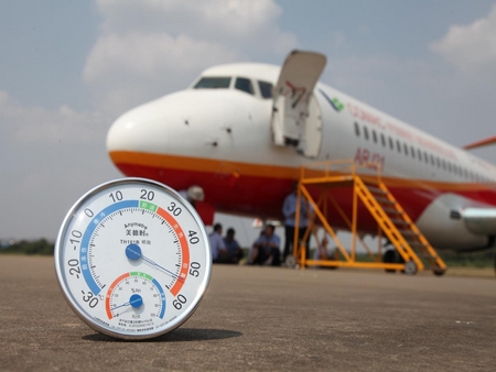開(kāi)飛前機場(chǎng)地面溫度已達到55攝氏度。