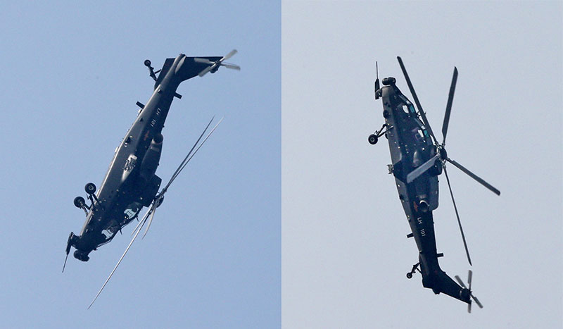 我國自主研制生產(chǎn)的武直-10武裝直升機亮相在珠海舉行的第九屆中國國際航空航天博覽會(huì ),在飛行表演中展示了這款直升機的優(yōu)良性能。