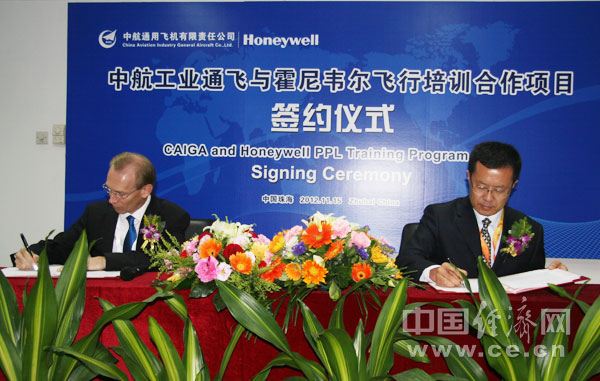 中國經(jīng)濟網(wǎng)珠海航展特派記者團 記者王飛11月16日報道 15日,中航通用飛機有限責任公司(以下簡(jiǎn)稱(chēng)“中航工業(yè)通飛”)副總經(jīng)理、珠海中航飛行學(xué)校有限公司董事長(cháng)沙長(cháng)安與霍尼韋爾航空航天(簡(jiǎn)稱(chēng)“霍尼韋爾公司”)亞太區總裁Briand Greer簽署了“飛機5用駕駛員駕照(PPL)項目合作備忘錄”。這標志著(zhù)中航工業(yè)通飛下屬的珠海中航飛行學(xué)校向霍尼韋爾公司的工程技術(shù)人員和管理人員提供飛行培訓服務(wù)的工作進(jìn)入實(shí)施階段。