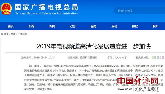 經(jīng)濟日報-中國經(jīng)濟網(wǎng)北京9月25日訊 國家廣播電視總局傳媒機構管理司發(fā)布信息:前三季度,廣電總局已批準114個(gè)電視頻道實(shí)施高清播出,是2018年同期的2.2倍。截至目前,全國各級播出機構經(jīng)批準高清播出的電視頻道已達331個(gè)(不含付費頻道),其中中央廣播電視總臺境內播出的高清頻道22個(gè),高清化比例為92%;省級上星綜合頻道26個(gè),高清化比例為84%;省級臺其他頻道82個(gè),高清化比例為32%;地級臺186個(gè),高清化比例為21%;縣級臺經(jīng)批準保留的頻道中有7個(gè)實(shí)現高清播出。此外,付費頻道中已批準38個(gè)轉為高清方式播出。新疆、上海、重慶、海南、天津、湖南、四川7?。ㄊ校┑氖〖夒娨曨l道高清化率較高,均超過(guò)了75%。湖南、廣東、內蒙古、江蘇、四川地級電視頻道高清化率較高,均超過(guò)了38%。