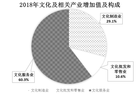 按行業(yè)大類(lèi)分,2018年文化制造業(yè)增加值為11999億元,占文化及相關(guān)產(chǎn)業(yè)增加值的比重為29.1%;文化批發(fā)和零售業(yè)增加值為4340億元,占比為10.6%;文化服務(wù)業(yè)增加值為24832億元,占比為60.3%。