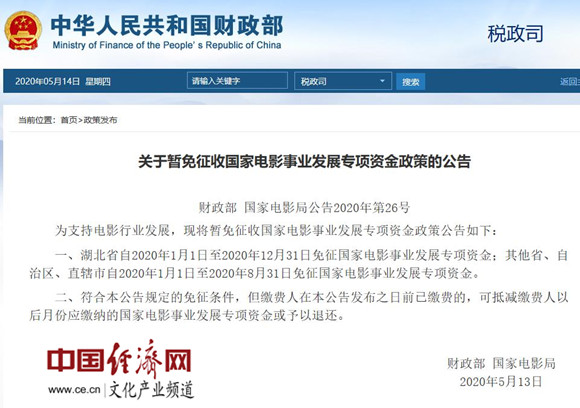 經(jīng)濟日報-中國經(jīng)濟網(wǎng)北京5月14日訊 2020年5月13日,財政部、國家電影局發(fā)布《關(guān)于暫免征收國家電影事業(yè)發(fā)展專(zhuān)項資金政策的公告》。據經(jīng)濟日報-中國經(jīng)濟網(wǎng)文化產(chǎn)業(yè)頻道(微信號:cewenhua)了解,財政部、國家電影局為支持電影行業(yè)發(fā)展,湖北省自2020年1月1日至2020年12月31日免征國家電影事業(yè)發(fā)展專(zhuān)項資金;其他省、自治區、直轄市自2020年1月1日至2020年8月31日免征國家電影事業(yè)發(fā)展專(zhuān)項資金。符合規定的免征條件,但繳費人在公告發(fā)布之日前已繳費的,可抵減繳費人以后月份應繳納的國家電影事業(yè)發(fā)展專(zhuān)項資金或予以退還。>>>更多政策可查看中國經(jīng)濟網(wǎng)“中國文化產(chǎn)業(yè)政策庫”