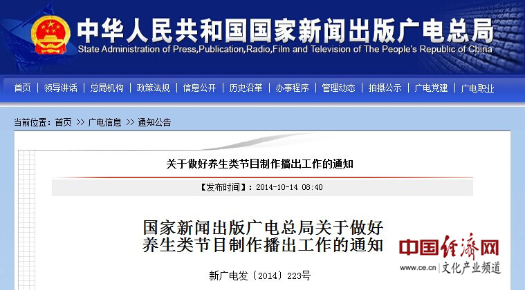 中國經(jīng)濟網(wǎng)北京10月22日訊 中國經(jīng)濟網(wǎng)文化產(chǎn)業(yè)頻道記者從國家新聞出版廣電總局網(wǎng)站獲悉,近日,國家新聞出版廣電總局針對養生類(lèi)節目存在夸張宣傳、廣告植入等問(wèn)題下發(fā)通知,規范養生類(lèi)節目播出秩序。通知要求,電視養生類(lèi)節目只能由電視臺策劃制作,不得由社會(huì )公司制作,并嚴禁以變相形式發(fā)布廣告等。以下為通知全文。