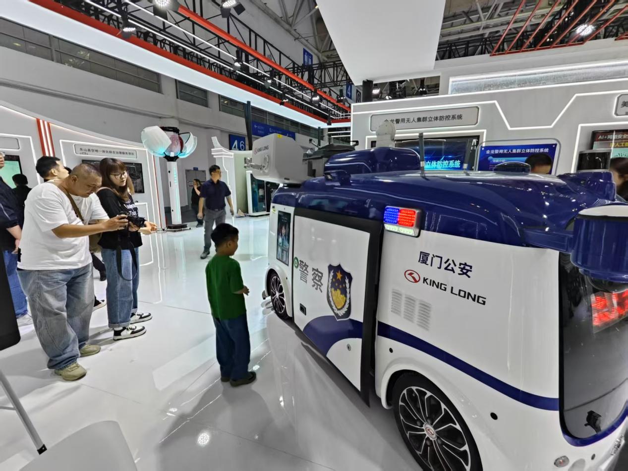 頭頂無(wú)人機、肚藏機器狗……集多種科技于一身的無(wú)人安防警車(chē)吸引了小朋友的目光。 中國經(jīng)濟網(wǎng)記者梁木攝