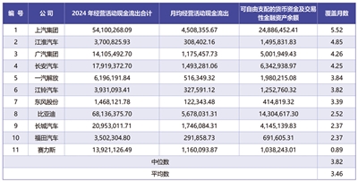 運用同樣的計算方法,包括上汽集團、比亞迪、長(cháng)城汽車(chē)、長(cháng)安汽車(chē)、廣汽集團、福田汽車(chē)等在內的11家車(chē)企中(見(jiàn)表格),其現金覆蓋月數中位數為3.82個(gè)月,平均數為3.46個(gè)月。其中,上汽集團現金覆蓋月數最多,達5.52個(gè)月;比亞迪、長(cháng)城汽車(chē)、福田汽車(chē)、賽力斯等車(chē)企現金覆蓋月數均低于3個(gè)月,賽力斯現金覆蓋月數最短,僅為0.89個(gè)月。