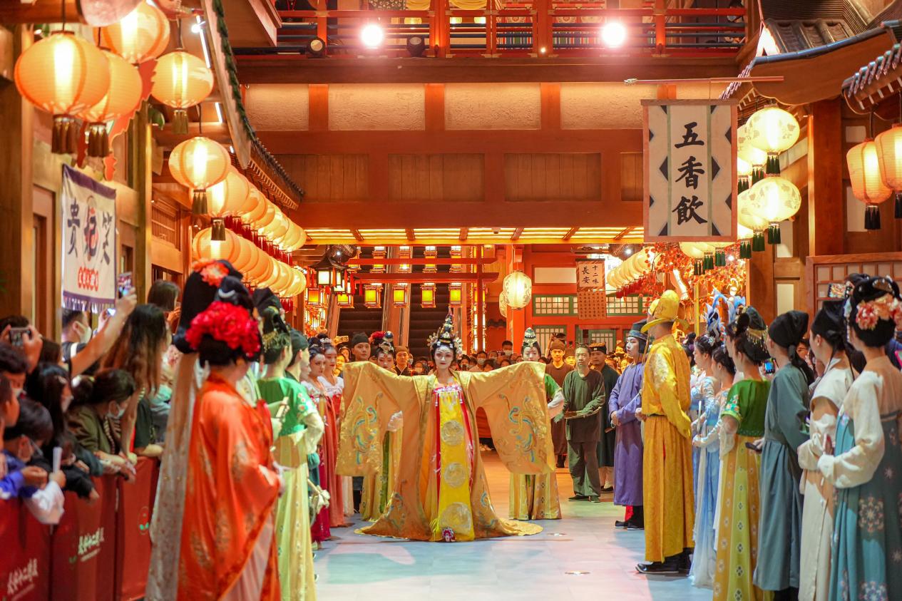 在西安,長(cháng)安十二時(shí)辰主題街區已成為現象級文化IP。這個(gè)以唐文化為底色的唐風(fēng)沉浸式主題樂(lè )園,不僅還原了唐長(cháng)安城坊市繁華場(chǎng)景,更通過(guò)“影視IP+文化創(chuàng )意+全感官沉浸式體驗”模式,開(kāi)業(yè)以來(lái)接待游客量突破700萬(wàn)人次,新消費場(chǎng)景也以輻射效應帶動(dòng)周邊餐飲、住宿、漢服產(chǎn)業(yè)增收?!拔覀儾皇呛?jiǎn)單復制唐文化,而是用年輕人喜歡的方式重構文化消費場(chǎng)景?!标兾魑穆每毓捎邢薰径麻L(cháng)、長(cháng)安十二時(shí)辰主題街區負責人鄒林豐介紹,街區將獨特的唐文化餐飲、漢服走秀、游戲沉浸式體驗與文化消費生態(tài)相融合,在激發(fā)游客文化歸屬感的同時(shí),持續帶動(dòng)街區二銷(xiāo)創(chuàng )收,2024年全年街區總收入達2.3億元。