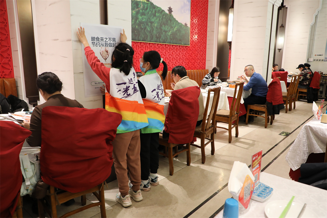 活動(dòng)中,七名“制止餐飲浪費”青少年志愿者將宣傳海報張貼在餐廳顯著(zhù)位置。