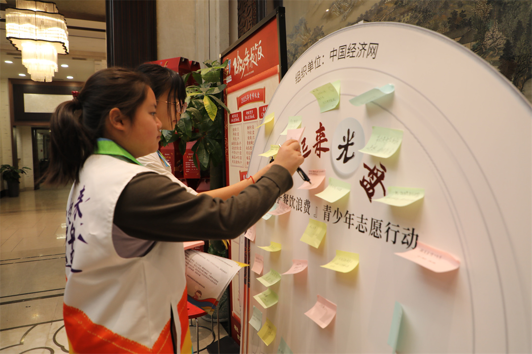 志愿者將節約糧食心得的標簽貼在活動(dòng)展板上 中國經(jīng)濟網(wǎng)記者 王巖/攝