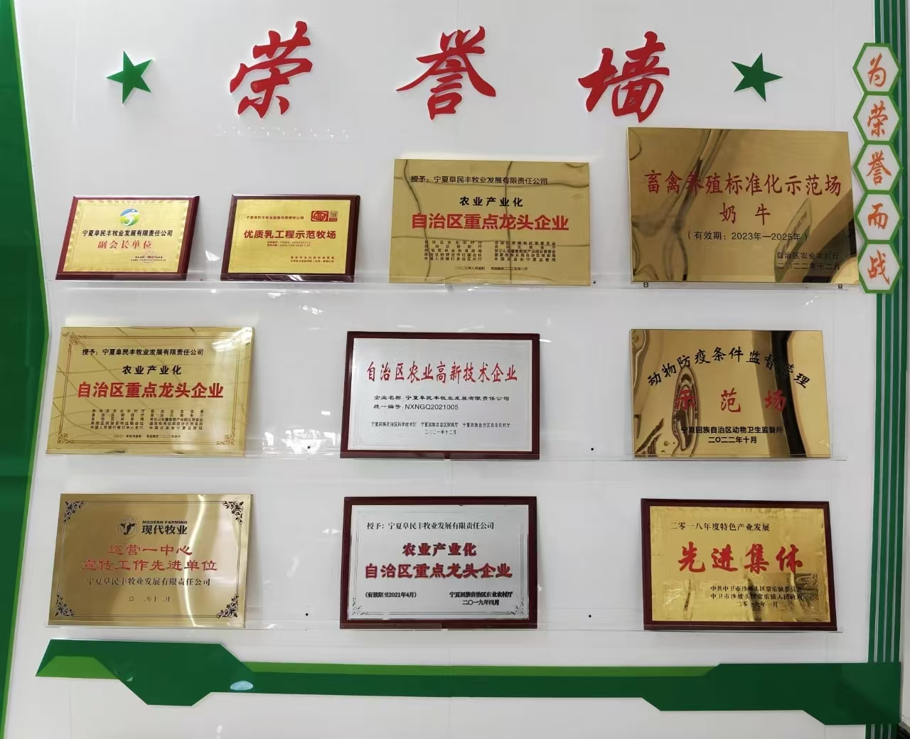 現代牧業(yè)阜民豐牧場(chǎng)連續多次被自治區列為扶貧龍頭企業(yè)和農業(yè)產(chǎn)業(yè)化重點(diǎn)龍頭企業(yè),并榮獲多項榮譽(yù)稱(chēng)號:2018年被評為特色產(chǎn)業(yè)發(fā)展先進(jìn)集體;2019年至今連續三次被自治區列為農業(yè)產(chǎn)業(yè)化重點(diǎn)龍頭企業(yè)、自治區扶貧龍頭企業(yè);2021年被評為自治區農業(yè)高新技術(shù)企業(yè);2022年被評為自治區畜禽養殖標準化示范場(chǎng)、自治區動(dòng)物防疫條件監督管理示范場(chǎng);2022年通過(guò)國家奶業(yè)科技創(chuàng )新聯(lián)盟認證,被評為優(yōu)質(zhì)乳工程示范牧場(chǎng);2023年被評為農業(yè)農村部畜禽養殖標準化示范場(chǎng);2023年順利通過(guò)QES管理體系認證。