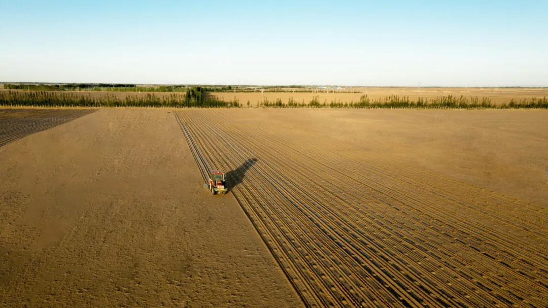 清晨的沙漠,陽(yáng)光刺破晨霧,灑在新翻耕的土地上。中國圣牧牧場(chǎng)的工人們正搶抓農時(shí),將奶牛重要的口糧——青貯玉米種子播撒進(jìn)土壤。