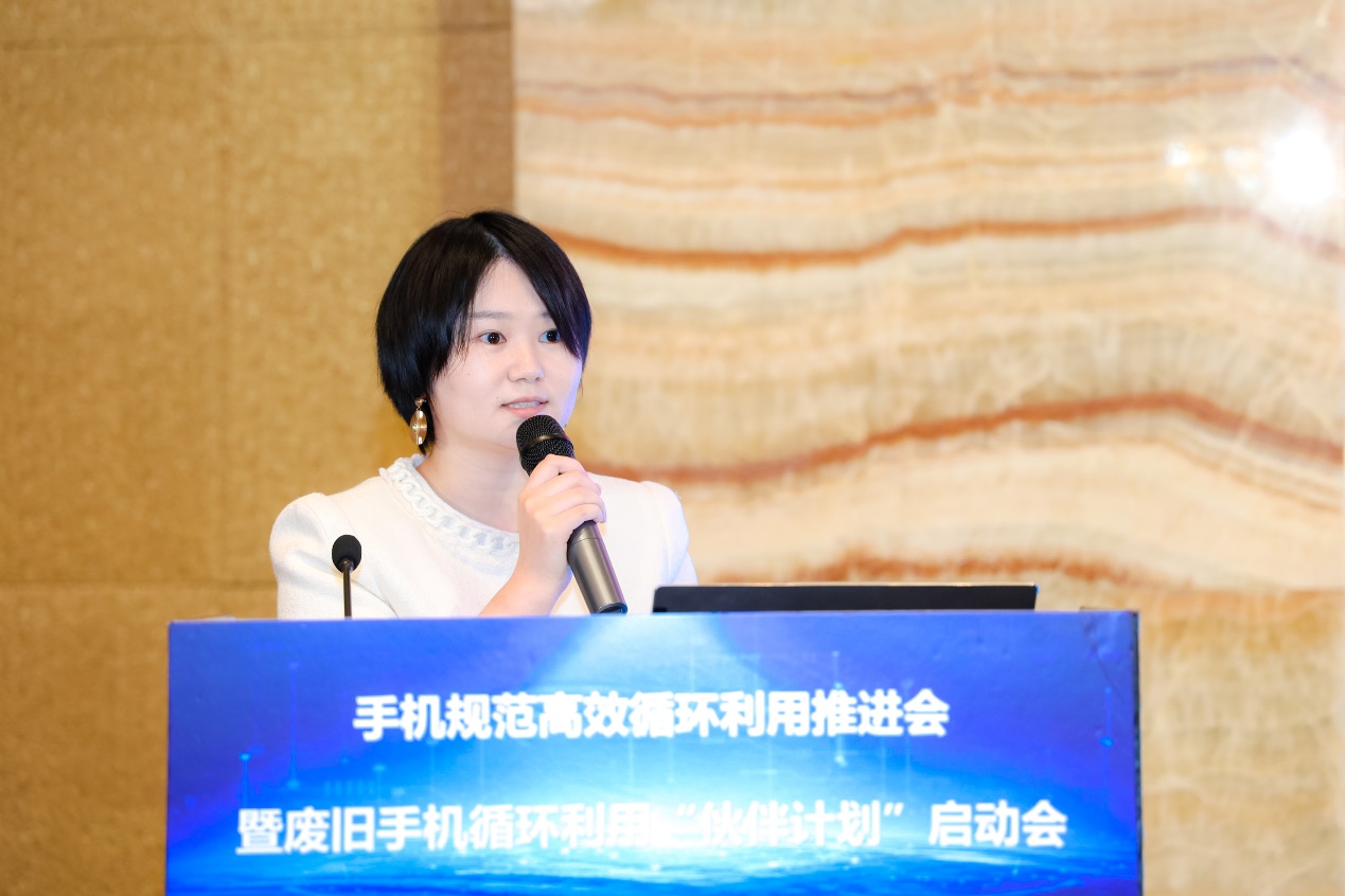 中國循環(huán)經(jīng)濟協(xié)會(huì )互聯(lián)網(wǎng)+資源循環(huán)利用專(zhuān)委會(huì )秘書(shū)長(cháng)侯允在會(huì )上發(fā)布廢舊手機循環(huán)利用團體標準框架。(主辦方供圖)
