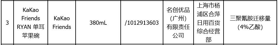 今年6月,上海市市場(chǎng)監管局網(wǎng)站發(fā)布的《2019年上海市兒童用餐具(密胺餐具)質(zhì)量監督抽查結果》顯示,標稱(chēng)名創(chuàng )優(yōu)品(廣州)有限責任公司生產(chǎn)的標稱(chēng)KaKao Friends RYAN 單耳蘋(píng)果碗(規格型號:380mL)被檢出三聚氰胺遷移量(4%乙酸)項目不合格。