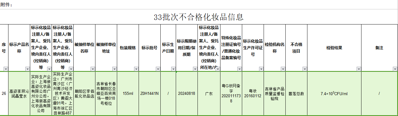 中國經(jīng)濟網(wǎng)北京11月16日訊(記者楊奇奇)11月15日,國家藥監局發(fā)布《關(guān)于33批次不合格化妝品的通告》顯示,1批次高姿澎湃沁潤晶瑩水不合格。