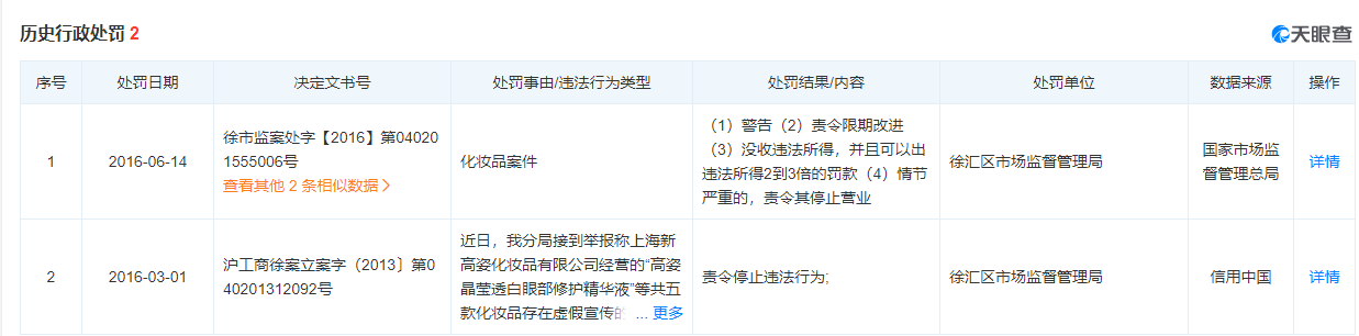 據天眼查,上海新高姿化妝品有限公司曾有兩次歷史行政處罰記錄,一次因添加了未經(jīng)審批的配方被警告,并沒(méi)收違法所得;一次因虛假宣傳,違反了《中華人民共和國反不正當競爭法》《上海市反不正當競爭條例》等相關(guān)法律被責令停止違法行為。