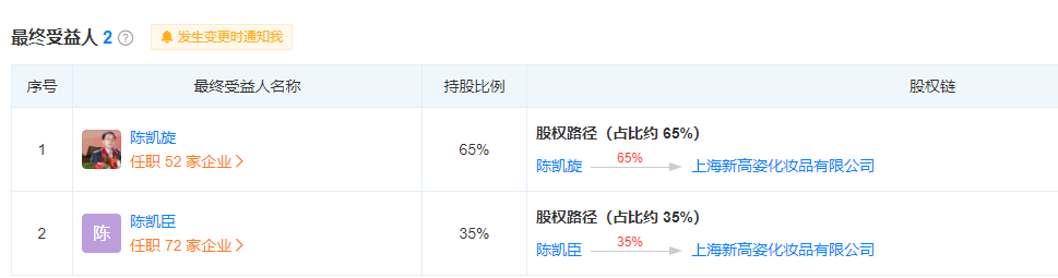 記者查詢(xún)資料顯示,上海新高姿化妝品有限公司共生產(chǎn)了800多款國產(chǎn)非特殊用途化妝品,其中包括高姿、赫拉、芊嘉、安妍雅等多個(gè)知名化妝品品牌。公司共有九個(gè)子公司,最終受益人為陳凱旋,持股占比65%。