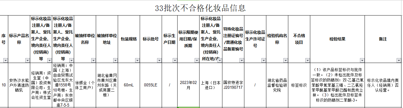1批次安熱沙防曬霜不合格資生堂否認經(jīng)營(yíng)