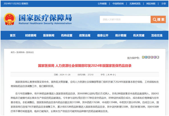 2024年醫保目錄調整從7月1日正式啟動(dòng),是國家醫保局成立以來(lái)的第7次國家醫保藥品目錄調整,將于2025年1月1日起實(shí)施。發(fā)布會(huì )上,國家醫保局醫藥服務(wù)管理司司長(cháng)黃心宇介紹,今年目錄調整范圍以新藥為主,新增的91種藥品中有90種為5年內新上市品種。國家醫保局將包括1類(lèi)化藥、1類(lèi)治療用生物制品、1類(lèi)和3類(lèi)中成藥在內的“全球新”作為重點(diǎn)支持對象,確?!昂娩撚迷诘度猩稀?。