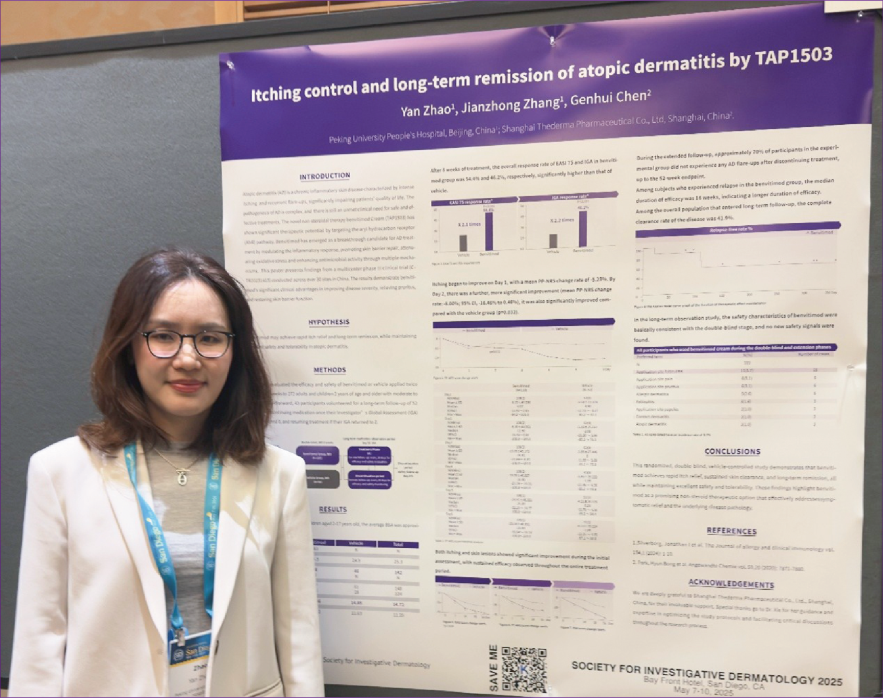 2025年第82屆美國皮膚病研究學(xué)會(huì )年會(huì )(SID)于5月7日至10日在美國圣地亞哥舉行,來(lái)自北京大學(xué)人民醫院趙琰教授關(guān)于澤立美本維莫德乳膏治療特應性皮炎的確證性臨床研究數據重磅亮相本次年會(huì )。這是首個(gè)且唯一針對中國人群的研究,展示了澤立美本維莫德乳膏在速效止癢、療效持久及安全性方面的顯著(zhù)優(yōu)勢。