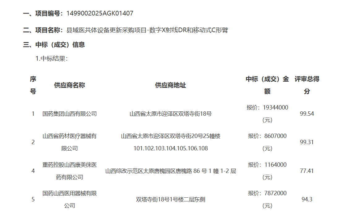 公告顯示,該項目為縣域醫共體醫療設備以舊換新項目,涉及山西省11個(gè)市的316家縣域醫療機構。項目共有5包,分別是數字X射線(xiàn)DR-1、數字X射線(xiàn)DR-2、數字X射線(xiàn)DR-3、數字X射線(xiàn)DR-4和移動(dòng)式C形臂。除數字X射線(xiàn)DR-3投標供應商數量不符合要求,系統自動(dòng)廢標外,國藥集團山西有限公司、山西省藥材醫療器械有限公司、重藥控股山西康美徠醫藥有限公司、國藥山西醫用器械有限公司中標其他四包,中標金額分別為19344000元、8607000元、1164000元、7872000元。其中,數字X射線(xiàn)DR為萬(wàn)東產(chǎn)品,移動(dòng)式C形臂為東軟醫療產(chǎn)品。