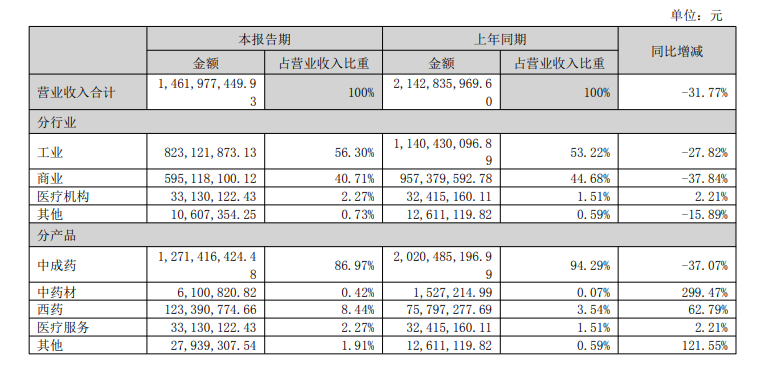 根據半年報,醫藥工業(yè)仍是貴州百靈業(yè)績(jì)重要支撐,貢獻逾一半營(yíng)收。具體來(lái)看,工業(yè)實(shí)現營(yíng)收8.23億元,同比下降27.82%;商業(yè)實(shí)現營(yíng)收5.95億元,同比下降37.84%;醫療機構實(shí)現營(yíng)收0.33億元,同比增長(cháng)2.21%;其他實(shí)現營(yíng)收0.11億元,同比下降15.89%。