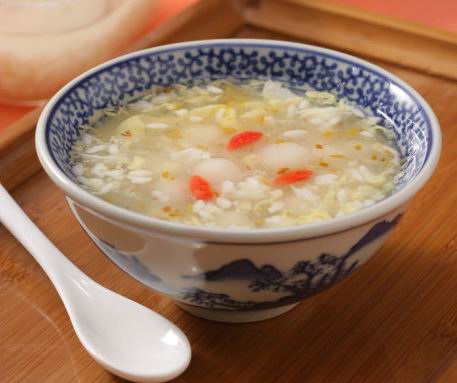 3.將一個(gè)雞蛋去殼打散,潑在滾開(kāi)的水上面,成為蛋花;