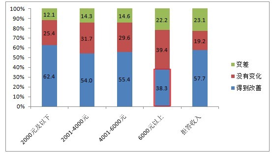收入水平在6000元以上的市民,認為過(guò)去一年食品安全沒(méi)有改善的人數遠大于認為有所改善的人數!