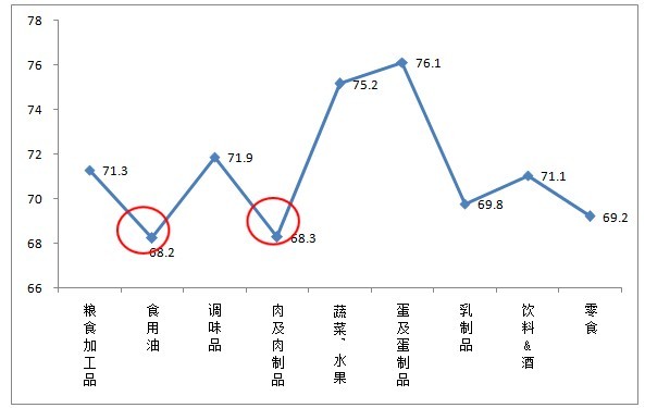進(jìn)一步分析發(fā)現,6000元以上高收入人群對食用油、肉及肉制品這兩類(lèi)食品的安全信心指數最低,直接影響了對食品安全現狀整體的信任度。